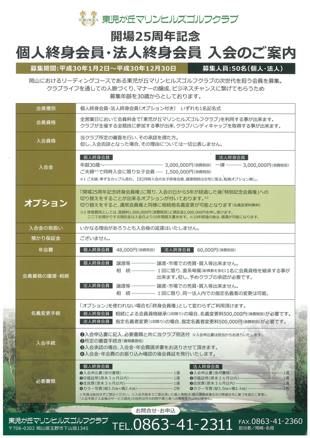 この度、東児が丘開場25周年を記念して「個人・法人終身会員」を募集致します。
